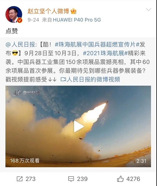 人民日報、新華社、中國日報、共青團中央、國資小新、騰訊軍事、鳳凰軍事、新浪軍事等新媒體發布的集團公司航展宣傳片等視頻作品燃爆全網,閱讀量突破三千萬人次,得到外交部發言人趙立堅轉載點贊。集團公司微信、微博、抖音號、微信視頻號等新媒體宣傳片播放閱讀量超過400萬人次。同時,央視新聞、新華社、中國之聲、央視軍事、央視新媒體、解放軍報、共青團中央、國資小新、環球時報等多家媒體對集團公司靜、動態展區進行現場直播,在電視端、客戶端、微信視頻號、微博、B站、快手、抖音等平臺受到高度關注。著名軍事專家杜文龍、央視主持人顧國寧、央廣中國之聲主持人王藝等直播兵器館、動態表演區裝備。
