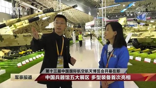 央視《新聞聯播》報道第十三屆中國航展,著重介紹了VT4主戰坦克,關注航展公眾日中國兵器館情況。9月28日下午央視《新聞直播間》航展特別節目《藍天盛會》邀請集團公司訪談嘉賓做客直播間對中國兵器館兵器工業集團展區等進行1小時直播;9月28日下午、10月2日下午分別對地面裝備動態表演進行兩場直播。央視《朝聞天下》、《新聞直播間》、《共同關注》、《天下財經》、《軍事報道》、《正午國防軍事》、《軍武零距離》等相繼推出集團公司參展裝備的報道。